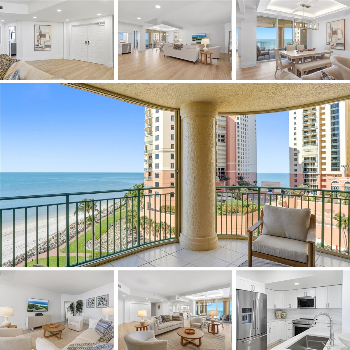 Coastal sophistication and Gulf-front elegance converge in this impeccably renovated 7th-floor residence, showcasing sweeping, unobstructed views of the Gulf of America. Encompassing 1,978 square feet, this refined 3-bedroom, 2-bathroom condominium embodies the very best of Marco Island living. An abundance of natural light fills the open-concept interior, where crown molding, wood-look tile flooring, and a striking coffered ceiling create a seamless blend of elegance and comfort. The thoughtfully designed kitchen is both functional and beautiful, featuring an expansive island, sleek solid surface countertops, stainless steel appliances, dual wine coolers, and abundant custom storage—perfect for both everyday living and entertaining. Step onto the spacious balcony to experience breathtaking Gulf vistas from sunrise to sunset, where turquoise waters and painted skies provide an ever-changing, picturesque backdrop. The primary suite offers a private retreat, complete with a cozy sitting area and a spa-inspired ensuite boasting dual vanities and a walk-in shower with multiple showerheads. Two additional bedrooms provide versatile space ideal for guests, a home office, or a personal studio. Residents enjoy an array of resort-style amenities, including direct beach access, a beachfront pool, fitness center, clubhouse, and tennis courts. Ideally located, you’re just moments from Caxambas Park, beloved local dining destinations such as Doreen’s Cup of Joe and the iconic Snook Inn, as well as the Shops of Marco for convenient shopping and entertainment. From pristine sugar-sand beaches and over 100 miles of scenic waterways to world-class dining and endless outdoor recreation, this exceptional residence offers more than a home—it delivers the quintessential Marco Island lifestyle.